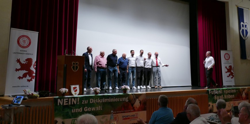 Ein besonderer Moment war, als sich alle anwesenden, aktuellen und ehemaligen Schiedsrichter der Hessenliga (bzw. Oberliga) auf der Bühne versammelten. (Titelbild von links: Holger Muschik, Hermann Dücker, Carsten Dücker, Werner Scheffler, Justin Herbert, Joshua Herbert, Dominic Dylka, Dietmar Weidenbörner und KSO Steffen Gaschitz)